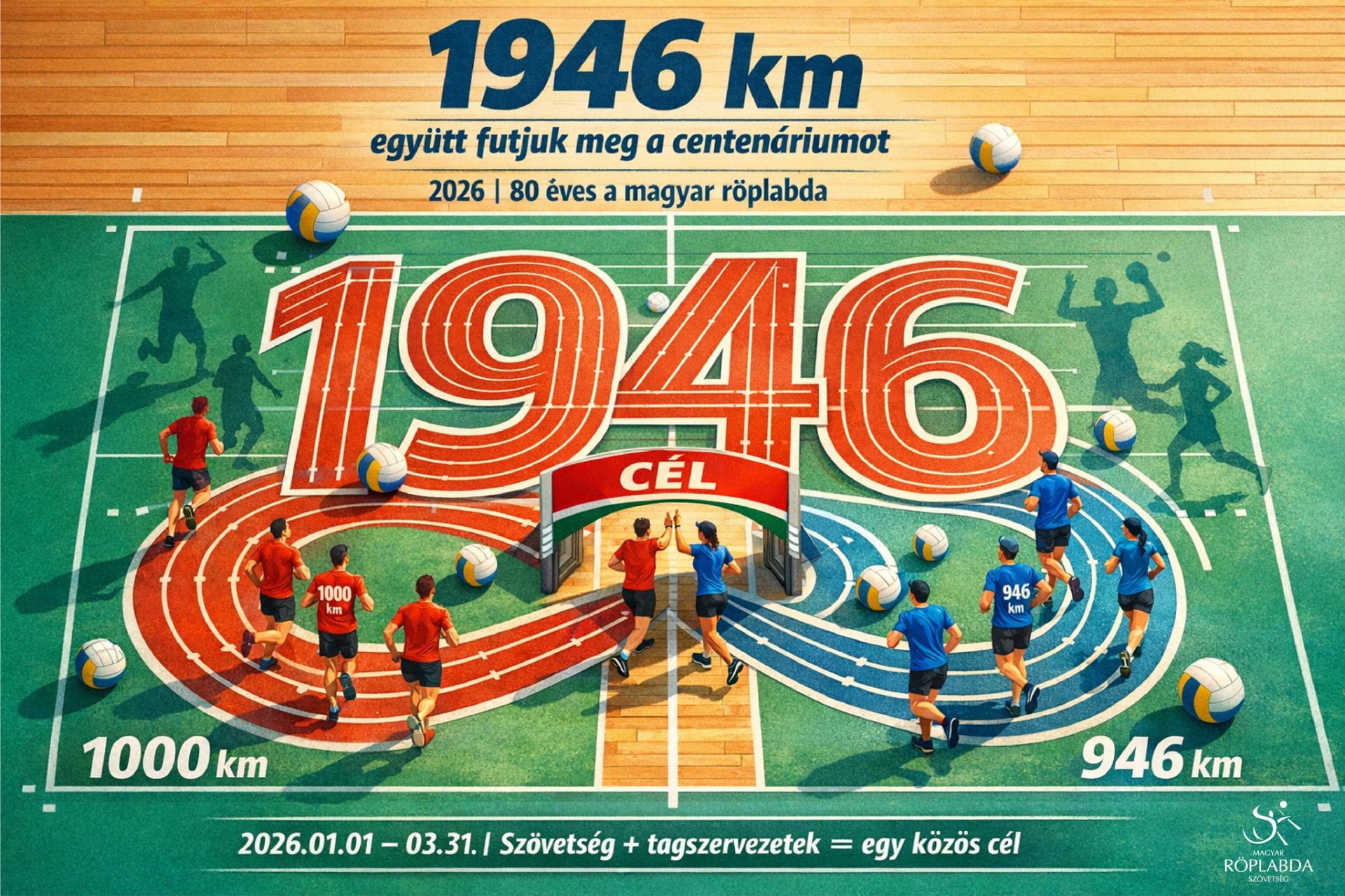 2026-ban a Magyar Röplabda Szövetség megalakulásának 80. évfordulóját ünnepli – nyolc évtized hagyomány, küzdelem és közös siker! Dr. Zalai Dávid, főtitkár kezdeményezésére ebből az alkalomból sportág-szintű, közösségépítő kihívást indít az MRSZ, amelyhez minden tagszervezetet és röplabdában dolgozó szakembert hívnak. A cél: 1946 kilométer teljesítése március 31-ig, tisztelegve az alapítás éve előtt.
