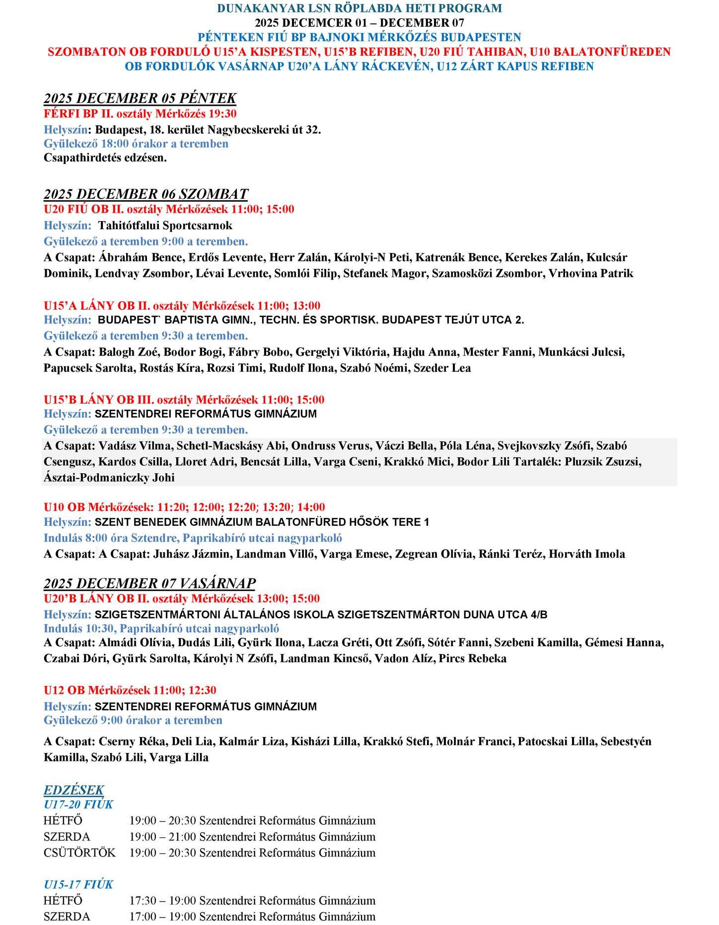 Elérkeztünk az idei év utolsó hónapjához, lássuk december első hetének eseményeit. A hétvége pénteken fiú Budapest bajnoki mérkőzéssel indul, ezt követően szombaton és vasárnap Ob-fordulókon lépünk pályára az ország különböző részein. Az alábbi táblázatban minden részletes információ megtalálható: