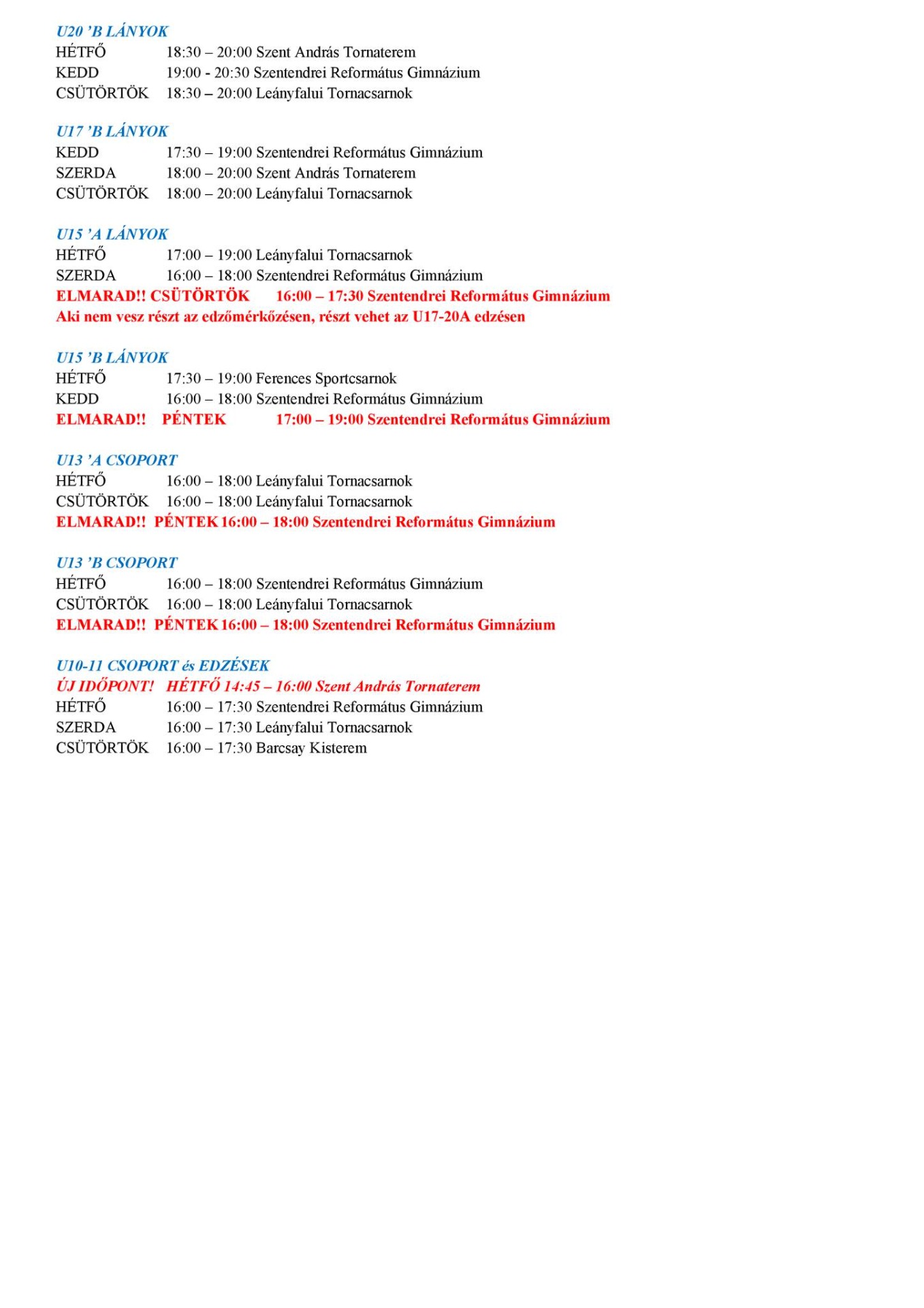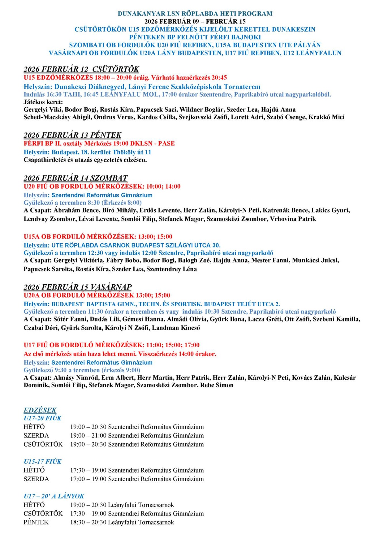 Íme, az aktuális programunk: csütörtökön U15-ös edzőmérkőzést játszunk Dunakeszin, pénteken felnőtt férfi bajnoki mérkőzésünk lesz Budapesten, hétvégén pedig több korosztályban is Ob-fordulókon lépünk pályára. Az alábbi táblázat minden fontos információt tartalmaz a mérkőzésekkel kapcsolatban, továbbá az edzéseket érintő változások is szerepelnek benne.