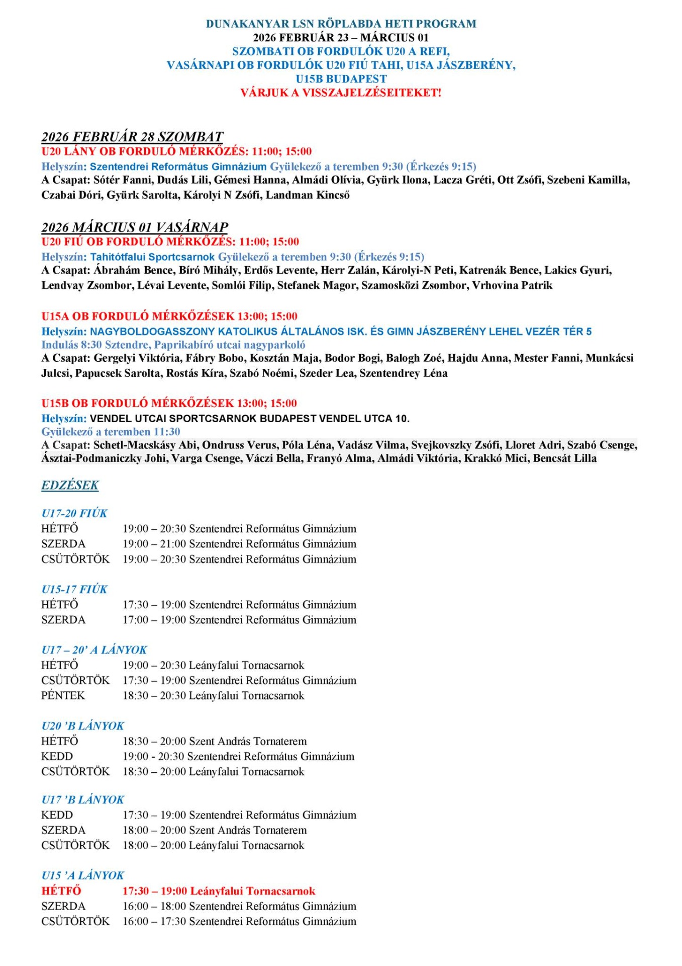 Elérkeztünk február utolsó hetéhez, lássuk az edzésen kívüli programokat! Szombaton U20-as leány Ob-fordulót játszunk Szentendrén, míg vasárnap szintén Ob-mérkőzések lesznek napirenden: az U20-as fiú korosztály Tahitótfaluban, az U15/A Jászberényben, az U15/B pedig Budapesten lép pályára.