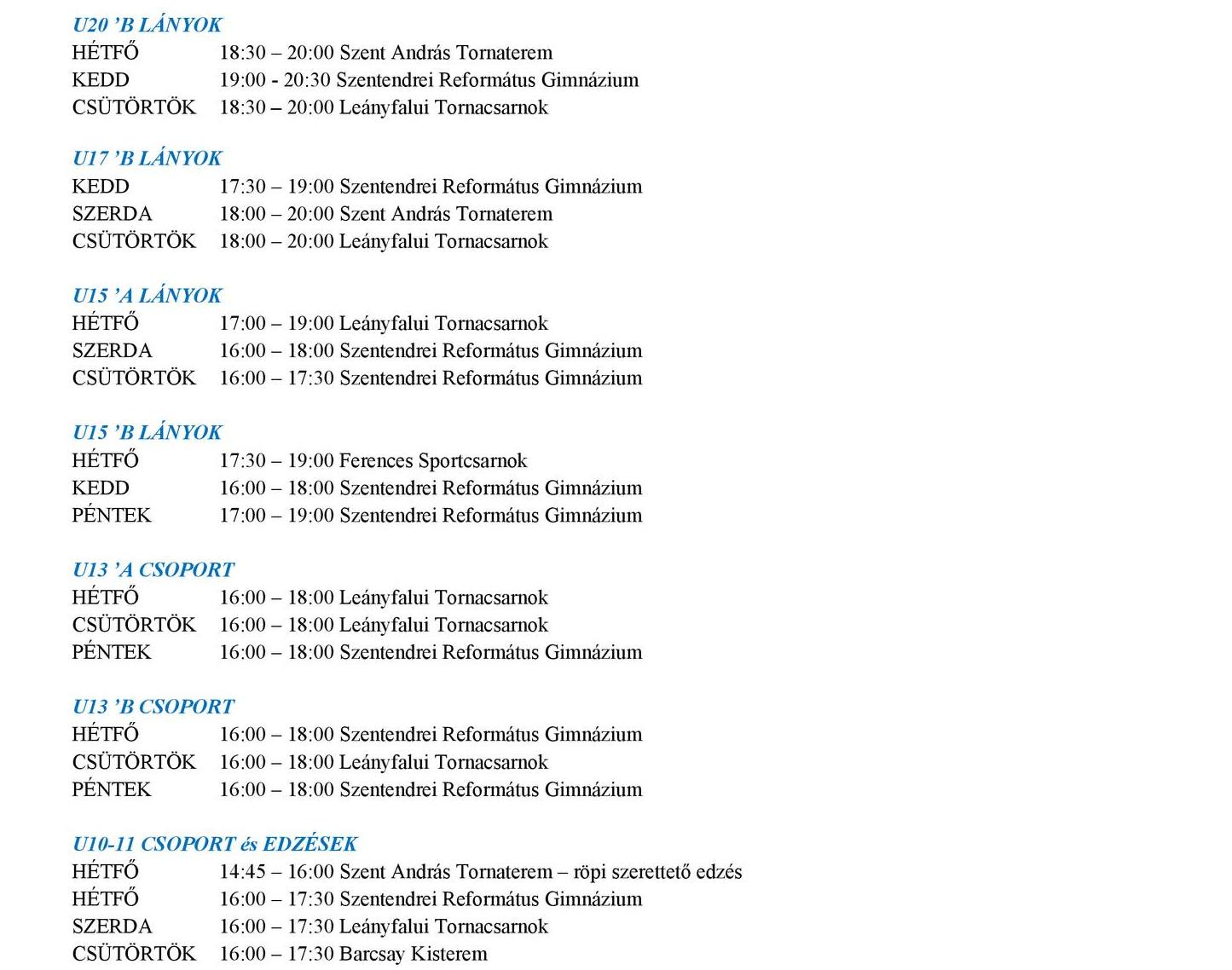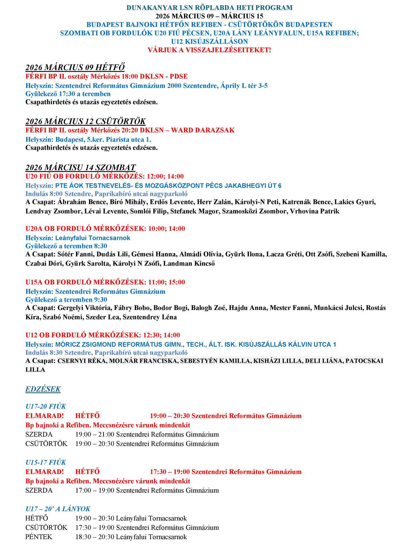 Heti programunk ezúttal is igen változatos. Hétfőn Budapest-bajnoki mérkőzést játszik férfi csapatunk Szentendrén, csütörtökön pedig Budapesten, míg szombaton Ob-fordulókkal folytatódik a sor, hiszen az U20-as fiúk Pécsre utaznak, U20/A leány csapatunk Leányfalun, az U15/A pedig Szentendrén lép pályára. Az edzésekben is találtok változást, részletek a táblázatban!